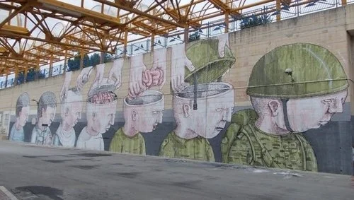 Blu is the pen name of an artist currently living in Bologna Italy. We don’t know his real name and may never know. When you even search up what he looks like in google the closest image we get of him is a shady man (or woman?) in a hoodie. Seems like a deepthroat sort of mystery with an artistic twist.