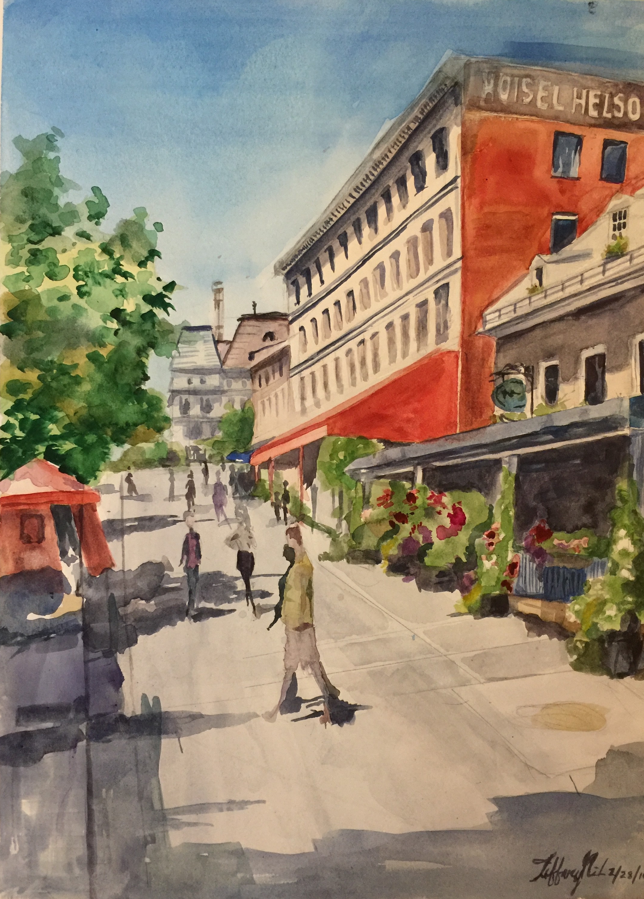 This watercolor painting portrays a lovely mid afternoon street scene in Montreal, Canada. The first building to the right is a flower shop andfurther down there is a little French hotel. To the left there is a little red tent and tree.