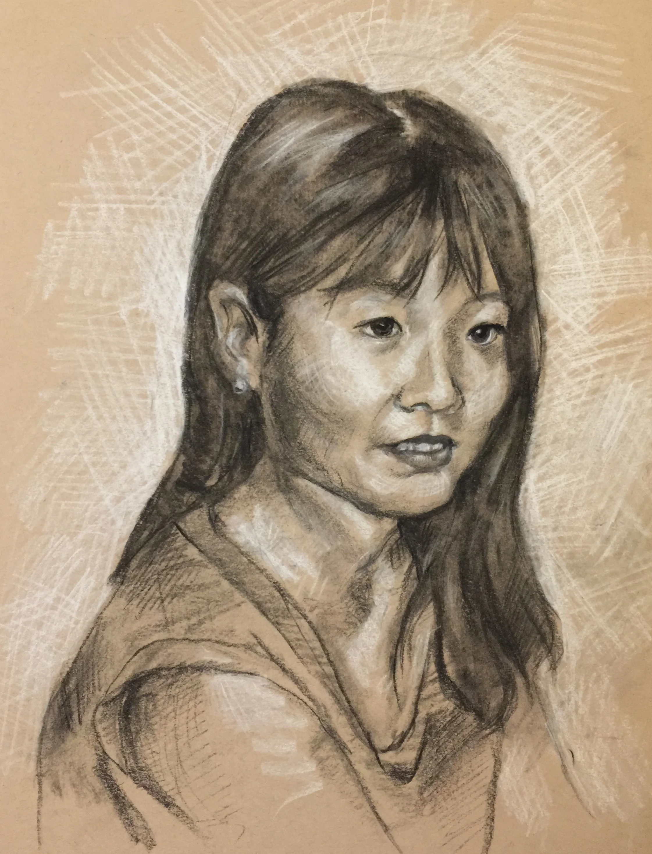 This is a white and black charcoal sketch on tan paper of my sister Megan