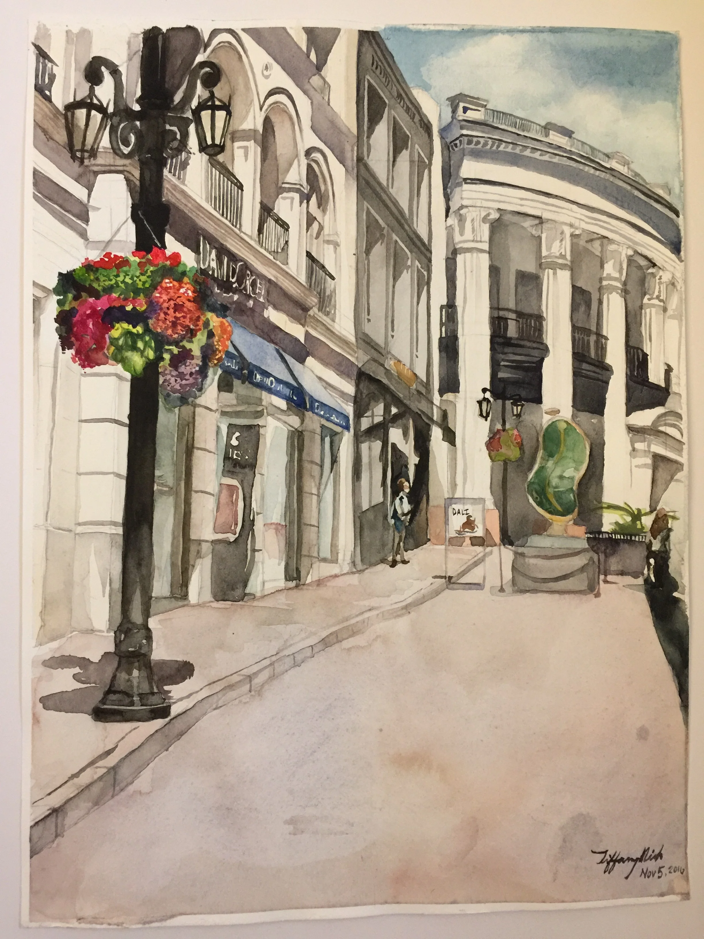 Watercolor painting of Rodeo drive in Beverly Hills, CA. In the back is the Porsche Design studio, and closer on the left is the David Orgell jewelry exhibit.